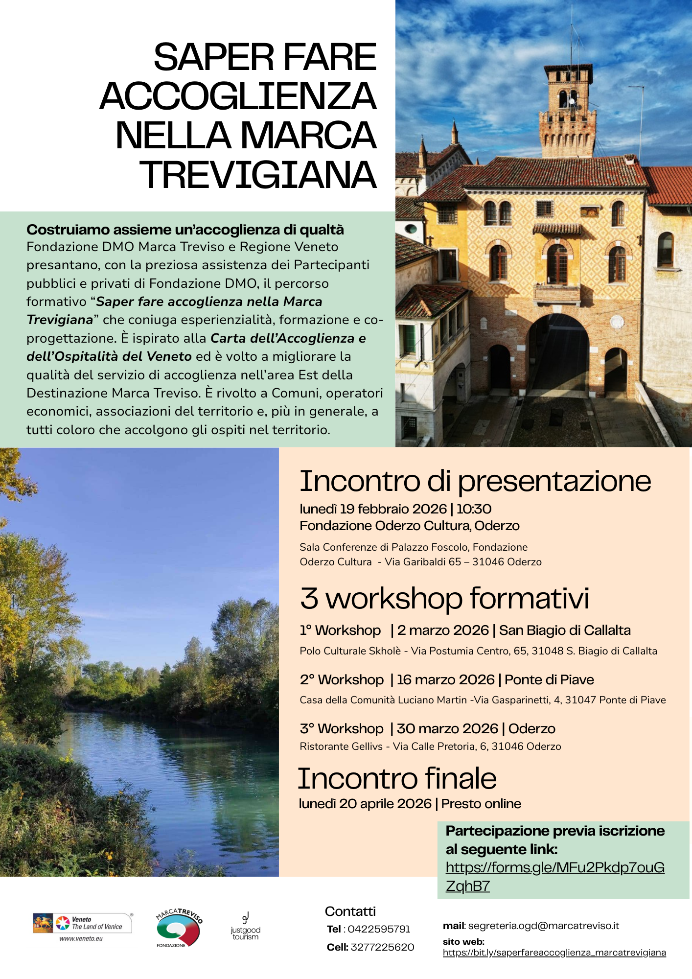 Il progetto è promosso da Fondazione DMO Marca Treviso in partnership con Regione del Veneto, realizzato con Just Good Tourism e con la preziosa collaborazione dei Partecipanti pubblici e privati di Fondazione DMO. L'obiettivo è consolidare un modello diffuso di accoglienza, in coerenza con la Carta dell’Accoglienza e dell’Ospitalità del Veneto e con le priorità del Piano Strategico DMO 2025–2027, traducendo i valori della Carta in azioni operative e replicabili.